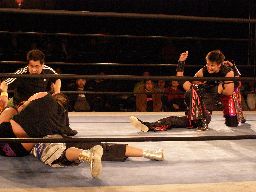 HANZO卍固め(右写真)、たけしがカット。HANZOはHAYATAにタッチ。東郷もたけしにタッチ。