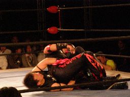 HANZOがたけしをバックドロップホールド(見えないけど左写真)、カウント3。
