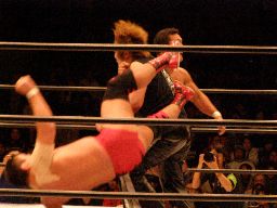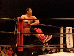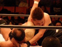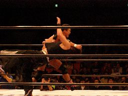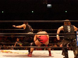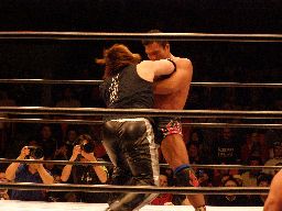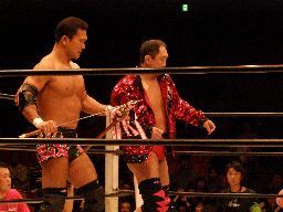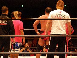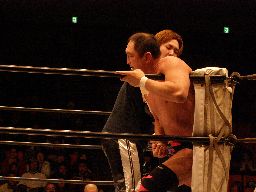 金本と田口がリングに(右写真)。ZERO-1の選手と客を口汚く罵る。ZERO-1にしか行かないって客はそういないんじゃないのかな?金本はしかし契約更改では毎年モメてるのにこういう場では「新日代表」になりたがるというのも不思議なもの。