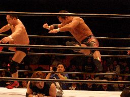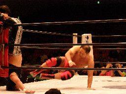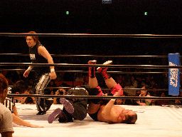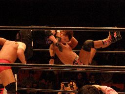 田中入ってダブルロープワークから田中がエルボードロップ(右写真)、大谷が顔面ドロップキック。