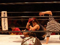 ダブルでコーナーに振る、田中は藤田をかわすが菅原がケブラドーラ・コン・ヒーロ(右写真)。