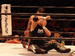 大谷が肩車した藤田に田中が飛びついてカッター(右写真)、菅原がカット。10分経過。