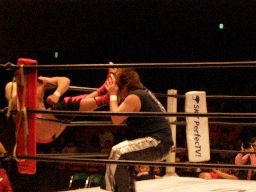 菅原は大谷の痛めている肩にエルボースタッブ、さらにロープで攻める(左写真)。コーナーに振って突っ込む、大谷かわしてカニばさみで倒す。