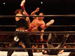 菅原エルボー(右写真)、藤田が入って延髄蹴り。