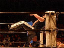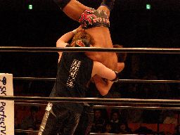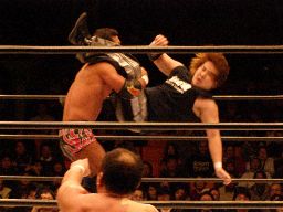 田中がコーナーに逆さ吊りにして大谷がスライディングキック(左写真)。