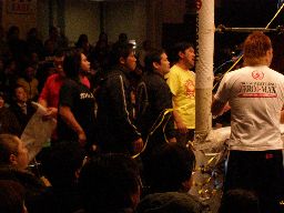 中西がZERO-1のセコンドに「誰もかかってこんのか!」とアジる。小笠原先生がかかって行こうとしたが止められる。そんなの予定にないからね。まあKAMIKAZEも『神風』時代に新日本とは因縁あるし、やる理由がある人がやるべきでしょう。第5試合に続いてなぜか田口だけが「帰れ!」と野次られてたのがなんかおかしかった。