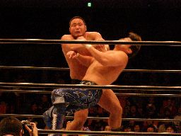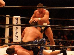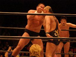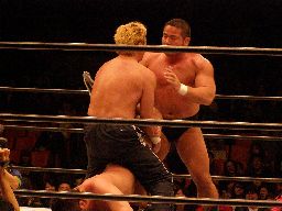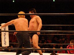 富豪2が中西の顔面に突き上げるようなヘッドバット連発(右写真)。これは効き目あり。