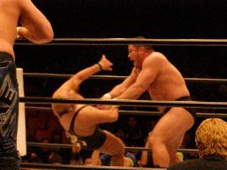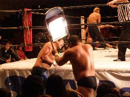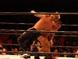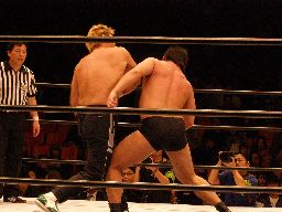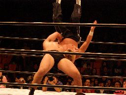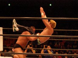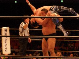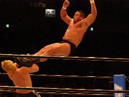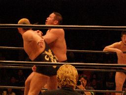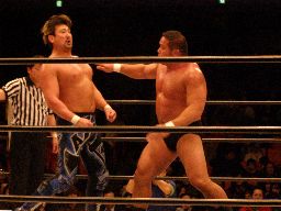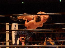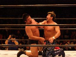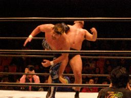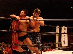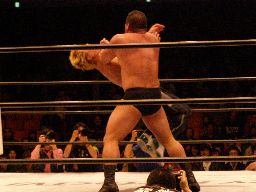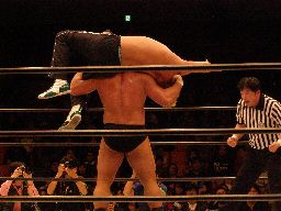 中西大森を担ぎ上げてヘラクレスカッター(右写真)。KAMIKAZEにクロスチョップからカバー、カウント2。