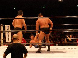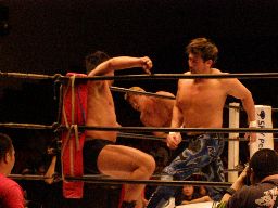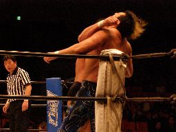 大森キャメルクラッチ(右写真)、中西がカットに入る、大森が中西を外に出す。KAMIKAZEが入る。
