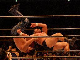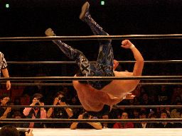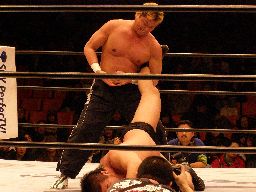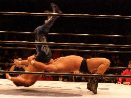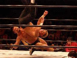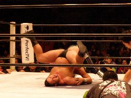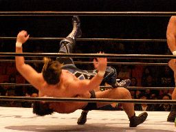 中西アルゼンチンバックブリーカー、KAMIKAZE着地して逆さ押さえ込み(右写真)、カウント2。