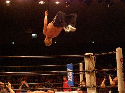 平澤コーナーに振って突っ込む、大森かわしてバックドロップ(左写真)、KAMIKAZEにタッチ。