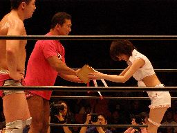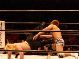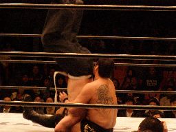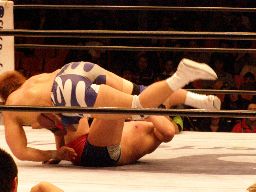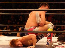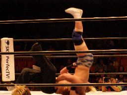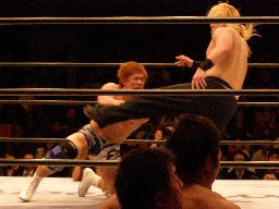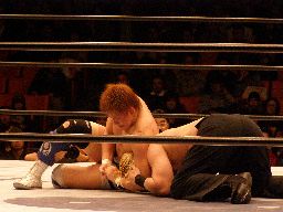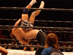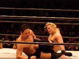 佐藤上になってマウント、十字に行くが崔は上体起こして丸め込む(左写真)、持ち上げることはできずロープ。佐藤は佐々木にタッチ。佐々木首投げ、ストンピングからスリーパー、首4の字に行くが崔はレッグロックに切り返す。真霜にタッチ。