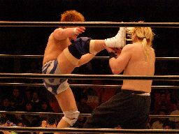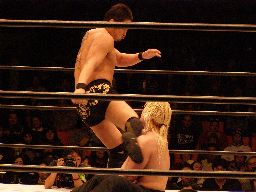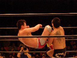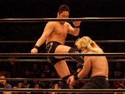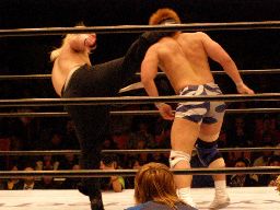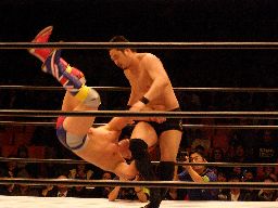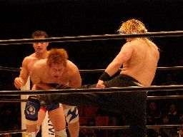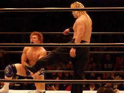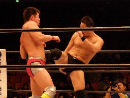 佐藤ジャーマン狙う、真霜ブロック。佐藤サッカーボールキック(右写真)、真霜キャッチしてドラゴンスクリュー。