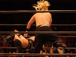 真霜スリーパーで締め上げる、リリースしてニードロップ、崔にタッチ。エルボーの打ち合いから崔はボディスラム、逆エビ固め(右写真)、佐々木ロープ。崔が場外に出す、場外で真霜がキック。真霜佐々木をリングに戻す。