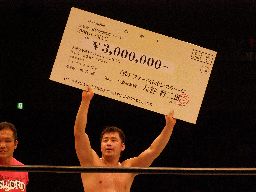 賞金3,000,000円の目録も。しかしそこまでSamurai!の中継解説をやっていた中村祥之渉外がリングに上がり「言いたいことがいくつもありますが、3月2日、中西vs大森と中邑vs佐藤のシングルが今新日本から連絡があって決定しました。」と。中継見たら解説やってるとこに新日本から電話がかかる様子が見れるのだろうか?なんだか「アックス軍vsソード軍」ってのもなかったことになりそうな雰囲気。別に楽しみにしてたわけでもないからいいけど。