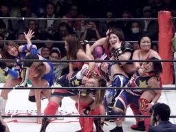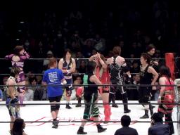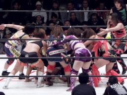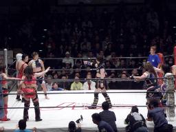 今回のバトルロイヤルは既発表選手の日向、輝、天野、宮崎、タニー、関西、尾崎、GAMI、田村、植松、さくらの11人は最初からリングにいて(右写真)、プラスシークレットゲストが3分経過後から1分ごとにリングに入ってくる形式。なおルールはオーバーザトップロープだけでなくリングアウトはすべて失格という特別ルール。