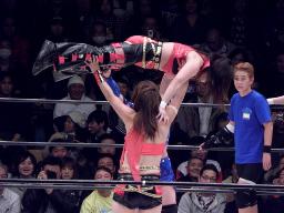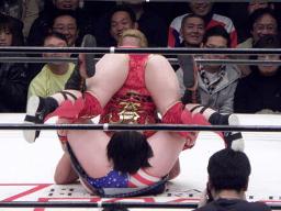 輝が宮崎に首固め(右写真)、カウント2。