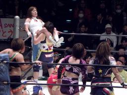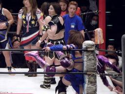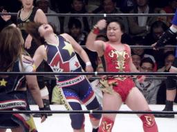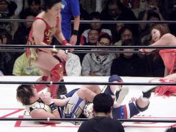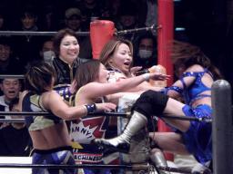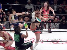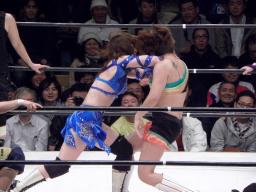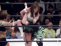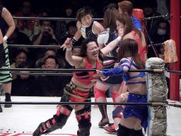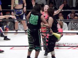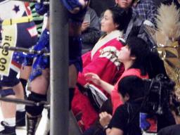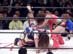 シークレットゲスト第2号は里村明衣子(右写真)。しかしタニーと宮崎がなんやかやと妨害してリングに上がれない。