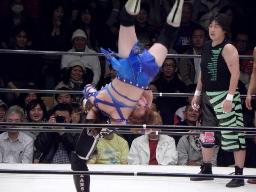 関西が日向にブレーンバスター(左写真)。