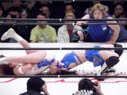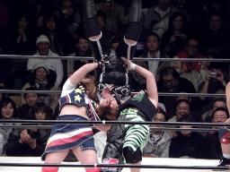 そうこうするうちに5分経過、3番目のシークレットゲストのジャガー横田が入場、GAMIに卍固め(右写真)。