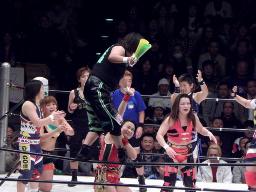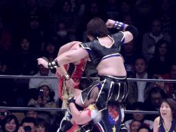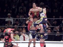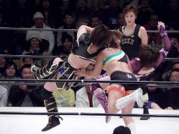 田村とさくらが木村にダブルのエースクラッシャー(右写真)。