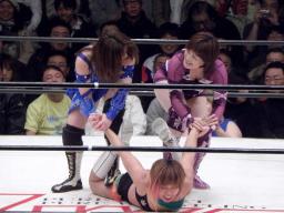 残るは宮崎、輝、天野の日向と同期だった3人。宮崎が天野を外道クラッチ(右写真)、カウント3。
