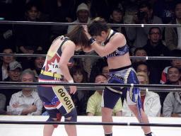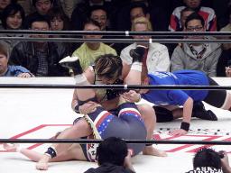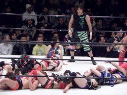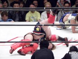 タニーが里村のエルボーで落とされるが田村が代わりに宮崎に騎乗して里村とエルボーの打ち合い(右写真)。しかし2人とも「下の人」によってオーバーザトップロープ。