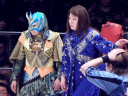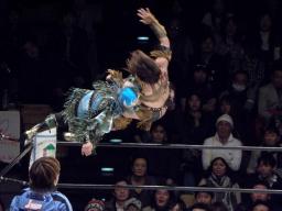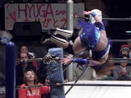 春山をリングに戻すとスワンダイブミサイルキック(左写真)、カウント2。コマンドにタッチ。