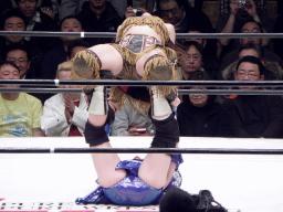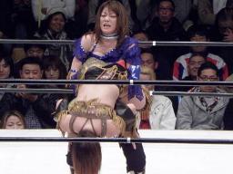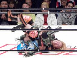 日向ジャーマン狙う、米山丸め込みにかかる(右写真)、しかし日向はパワーで投げる。さらにロコモーション式でジャーマン連発、カウント2。