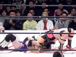 春山ローリングクレイドル(右写真)、コマンドまたワキ固めに、米山がカット。春山さらにローリングクレイドル、カウント2。米山にタッチ。