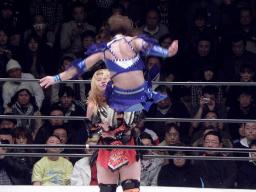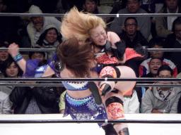 日向みちドラ狙う、米山着地。日向ジャーマン狙う、これも着地。米山エルボー(右写真)からジャーマン、カウント2。
