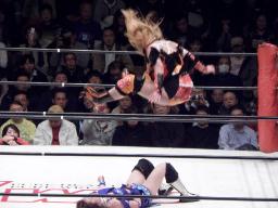 米山が日向にダイビングギロチンドロップ(左写真)。