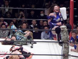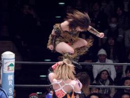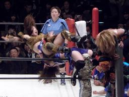 日向コーナーに上る、春山追いかけて雪崩式パワースラム(右写真)、コマンドがカット。