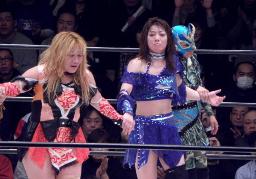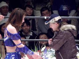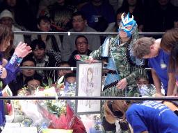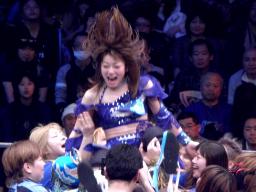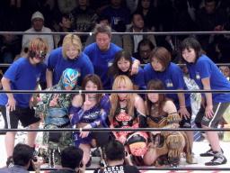 JWP選手の作る騎馬に乗ってリングサイドを一周(左写真)。