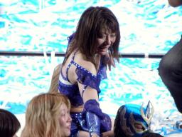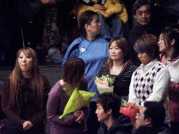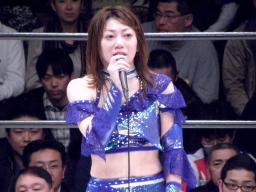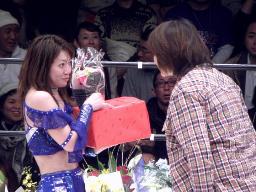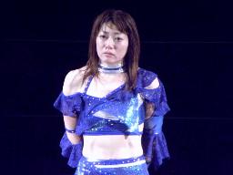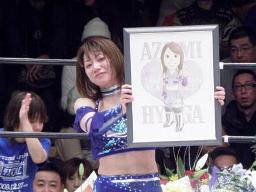 本人挨拶(右写真)。「最後月並なことしか言えないんですけど、15年やってこれたのは先輩や同期、後輩、マスコミの方やスタッフの方、家族や親戚のみなさん、そしていつも応援してくれたみなさんのおかげだと思ってます。本当に感謝の気持ちでいっぱいです。どうもありがとうございます。私は今日でリングを降りるんですけども、選手みんなまだまだ体を張って頑張っているんで、これからも女子プロレスが盛り上がるように応援よろしくお願いします。15年間本当にどうもありがとうございました。」