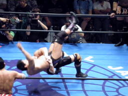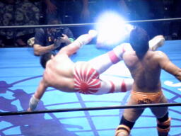 小橋ブレーンバスター、KAI着地して延髄蹴り(左写真)、さらにドロップキック打ち込んで小島にタッチ。