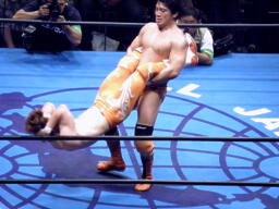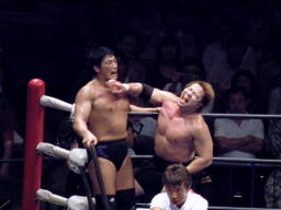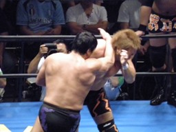 ロックアップから小島ヘッドロック、小橋が力で切り返すと小島はバックドロップに(左写真)。