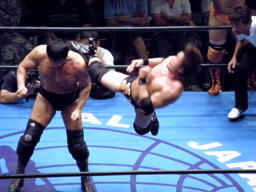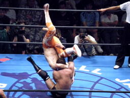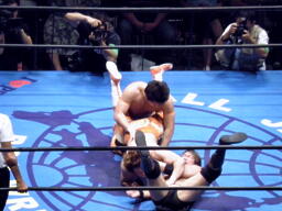 小島とKAIがダブルのブレーンバスター狙う、小橋と菊地が入り3人で2人を投げる(左写真)。