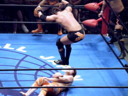 伊藤裏蹴り、ジャーマン(右写真)、カウント2。コーナーに上ってフロッグスプラッシュ、これも2。