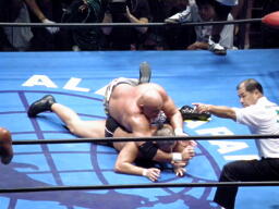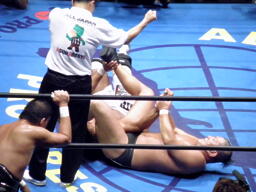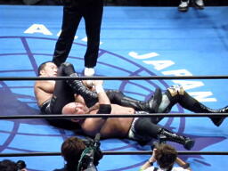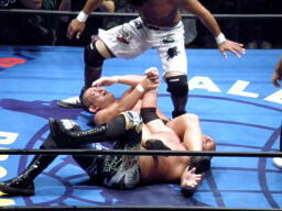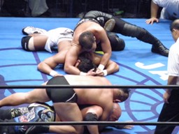 鈴木は武藤にもスリーパー、蝶野は船木をバタフライロックで押さえる(左写真)。