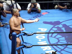 鈴木は自軍コーナーから移動して船木を挑発(右写真)。