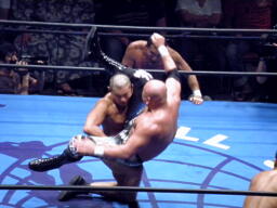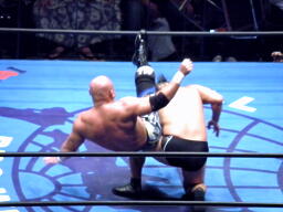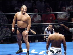 蝶野が腕を取りに行く、武藤足をすくうが蝶野はキーロックに(左写真)、武藤ロープ。武藤フルネルソン、蝶野ロープ。蝶野カニばさみで倒しフェースロック、武藤は船木にタッチ。