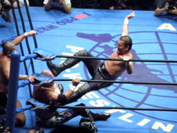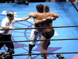 蝶野ロープに振る、船木ショルダーブロック(左写真)。不自然さは全くなし。5分経過。