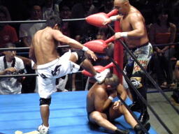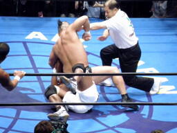 船木はヒザ十字に切り返す(左写真)、鈴木ロープ。船木キック入れて武藤にタッチ。