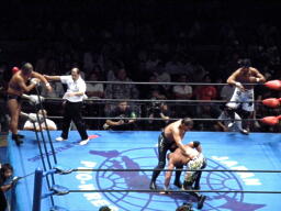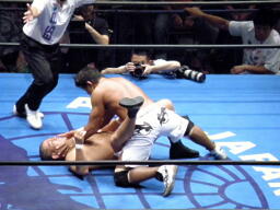 武藤再び低空ドロップキック→ドラゴンスクリューを出すが鈴木は十字に切り返す、船木がカット(右写真)。