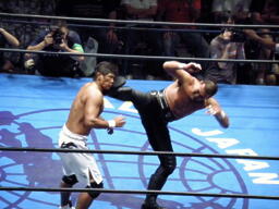 武藤鈴木にシャイニングウィザード(左写真)。