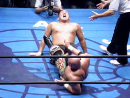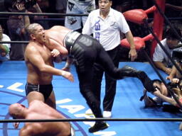 鈴木が武藤を場外に出す。場外で蝶野が攻撃。武藤がリングに戻ると鈴木ネックロック(左写真)、蝶野にタッチ。