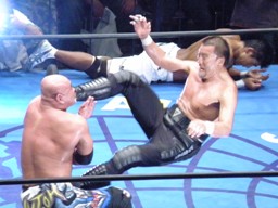 蝶野は串刺しケンカキック(左写真)、武藤ドロップキック、船木にタッチ。