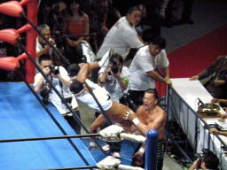 船木蝶野にソバット(右写真)、蝶野場外転落。船木は両国のつながったイスで無理矢理イス攻撃。この辺が実戦のカンのなさか。