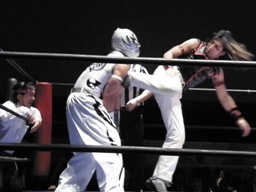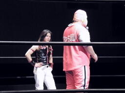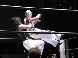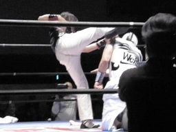 高山が全く戦闘意欲を失ったためRionがリングイン。鈴木もヴァイスに代わる。Rionソバット(右写真)、ハイキック、カウント2。